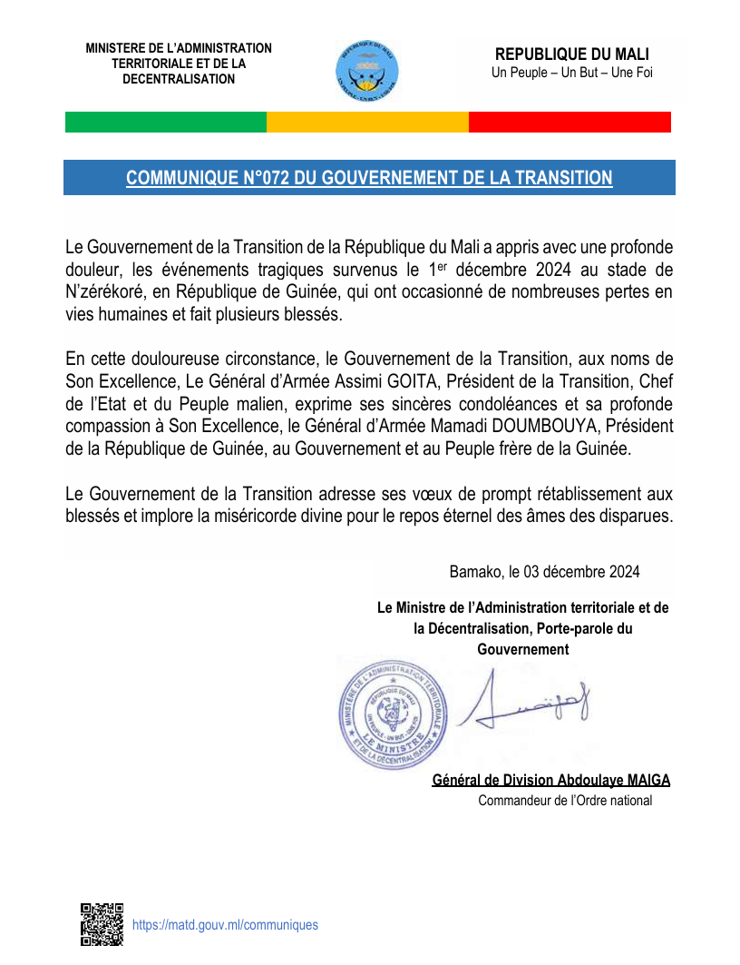 ORTM_COMMUNIQUE N072 DU GOUVERNEMENT DU MALI_EVENEMENTS TRAGIQUES N’ZEREKORE RÉPUBLIQUE GUINÉE