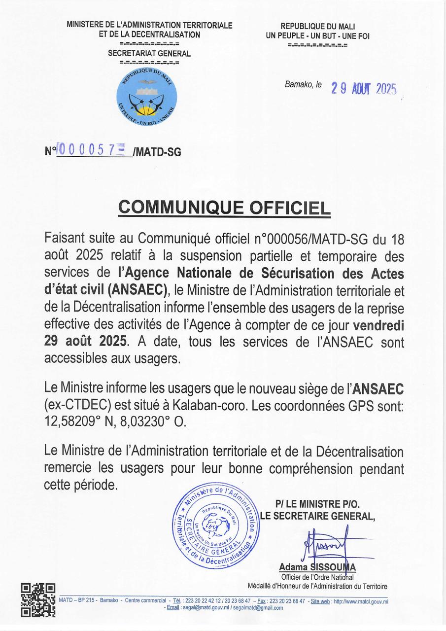 COMMUNIQUÉ OFFICIEL
